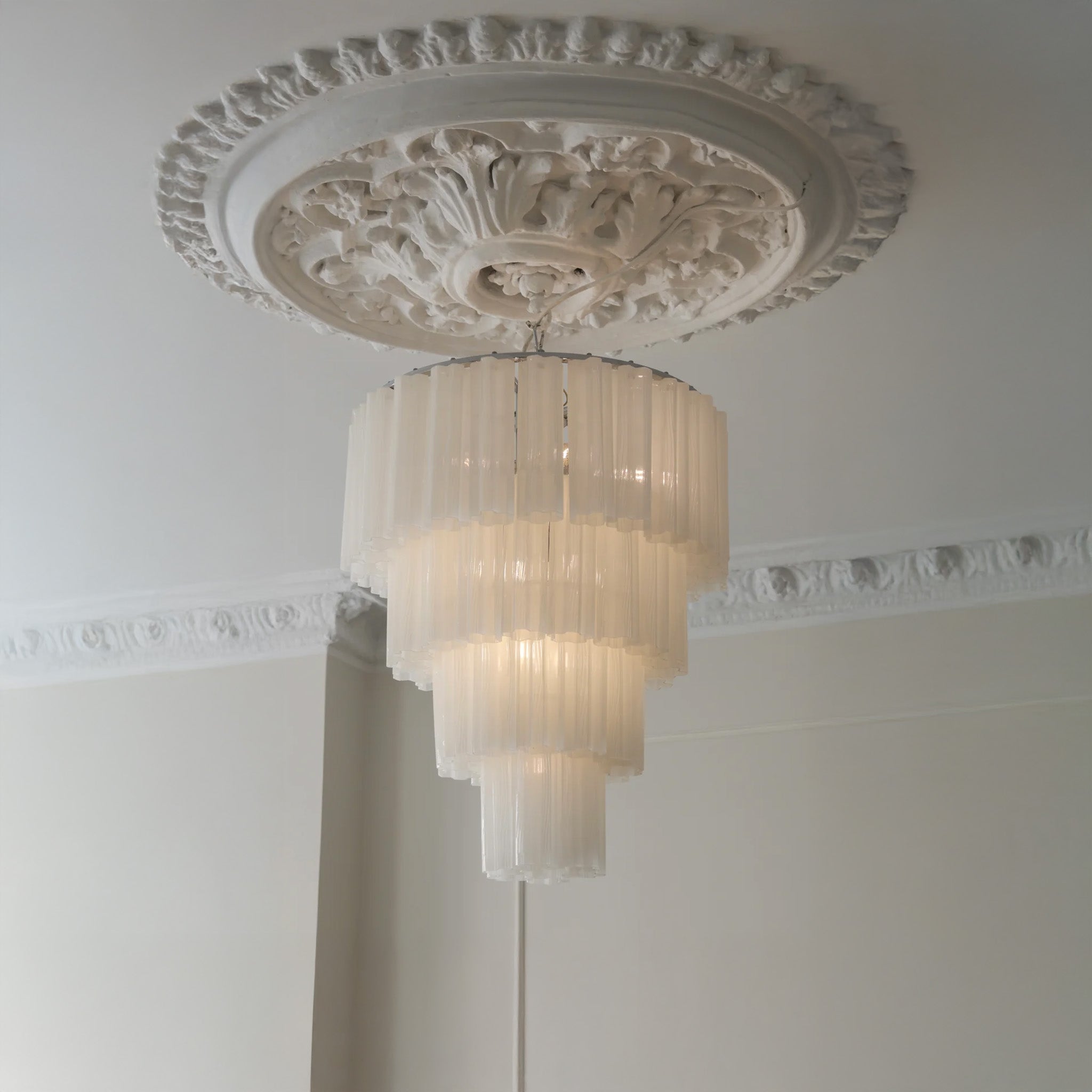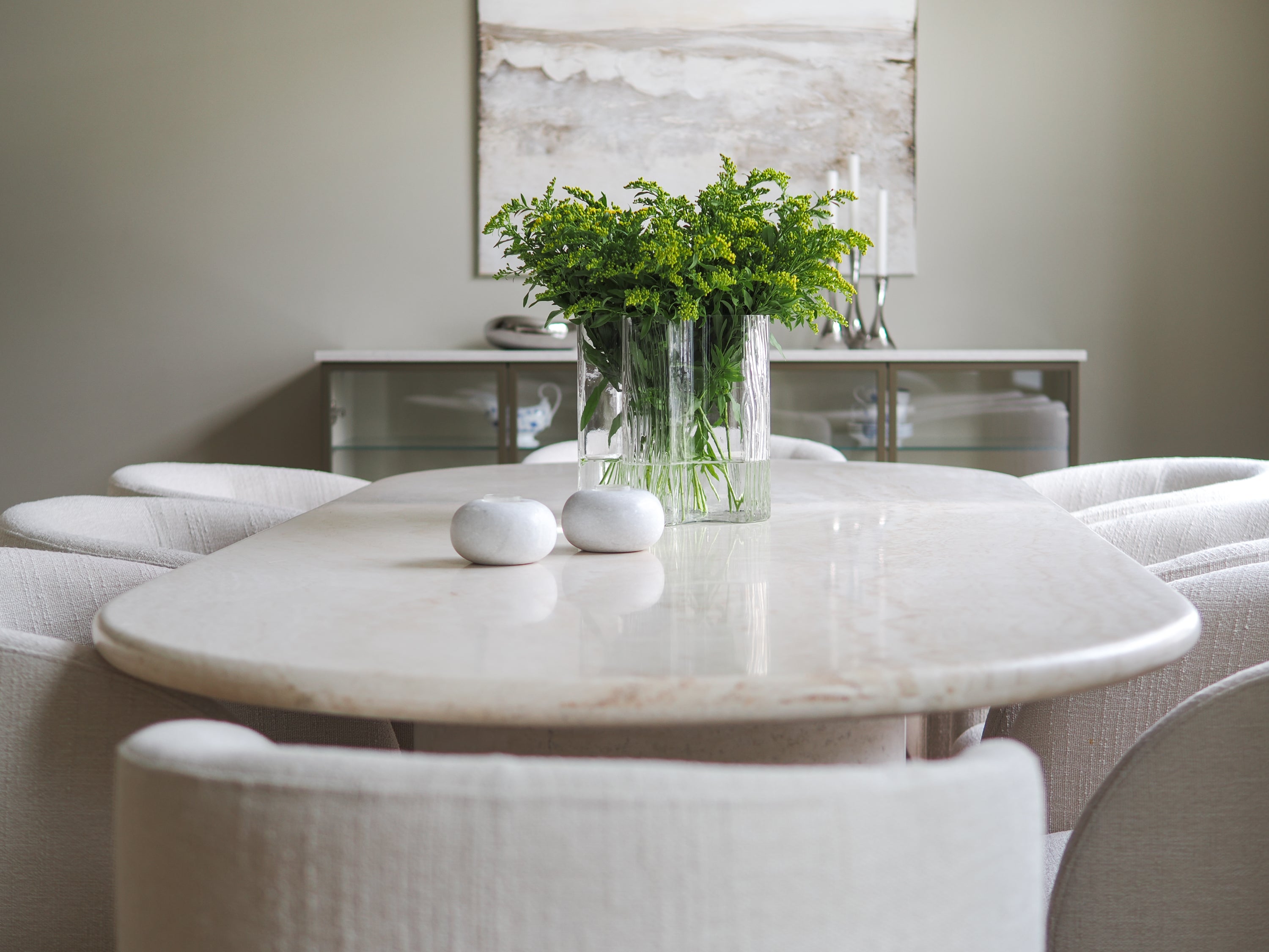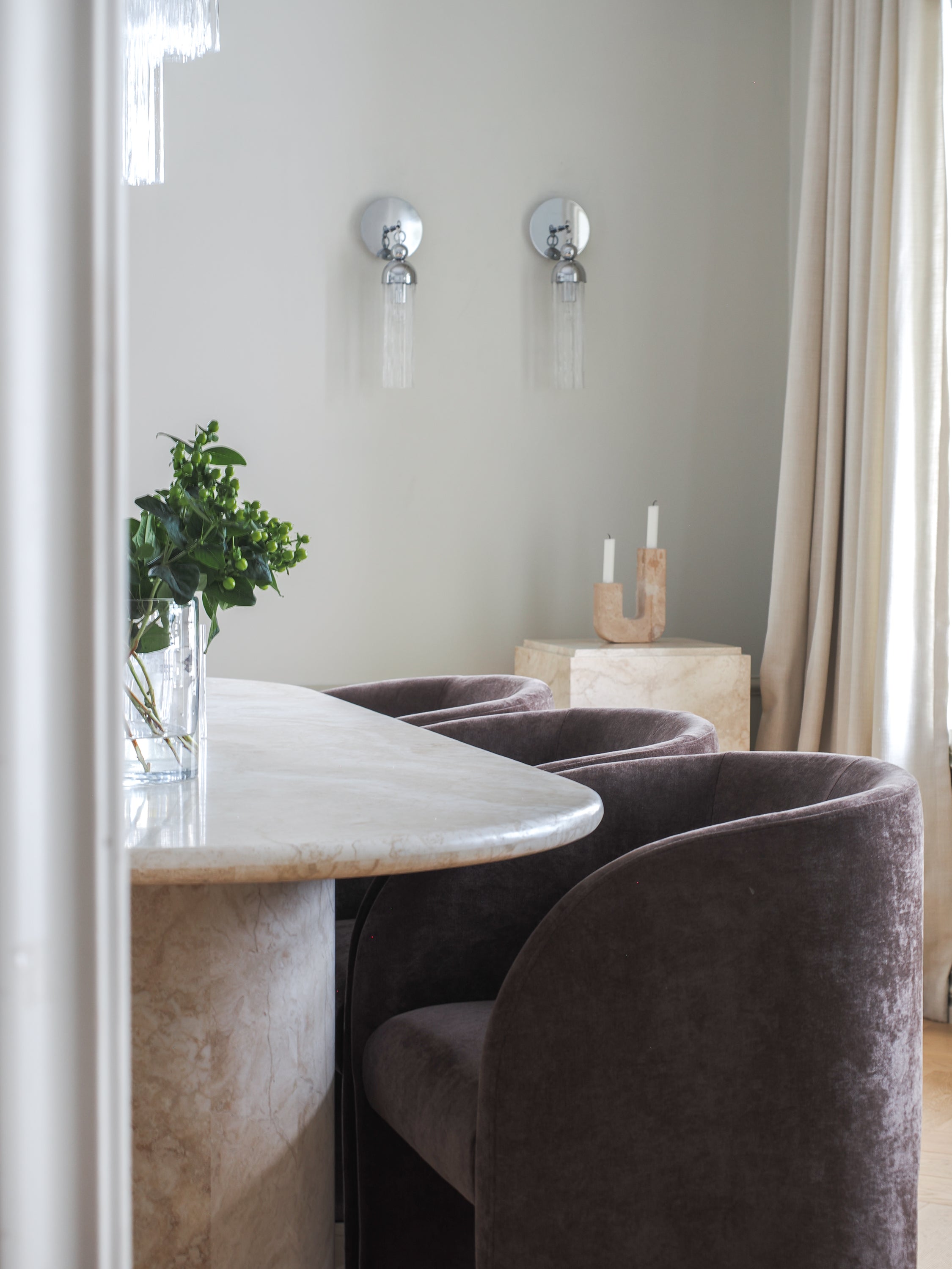 We envisioned classic furniture, sculptural glass chandeliers, and tactile